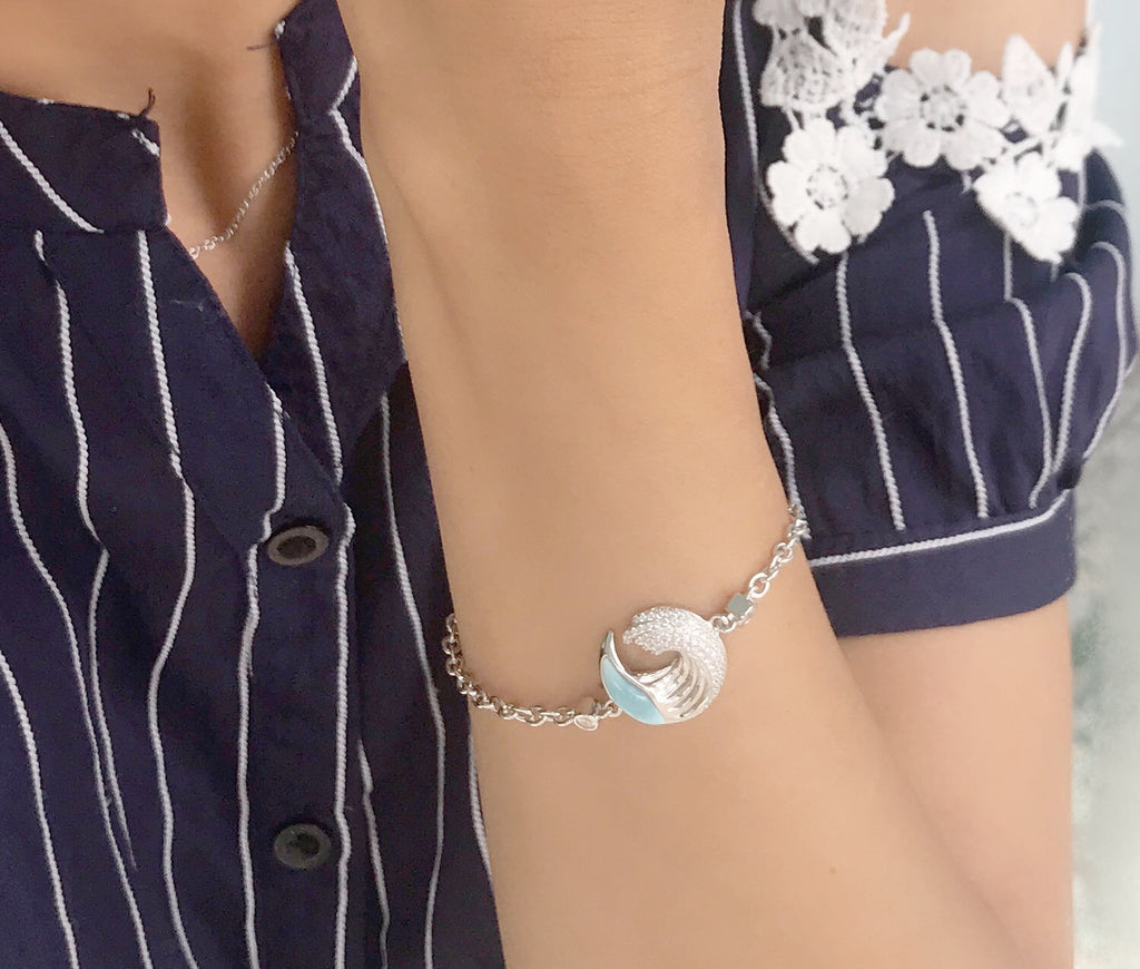 925 Sterling Silver Hawaiian Ocean Wave CZ Genuine Natural Larimar Bracelet 7"+